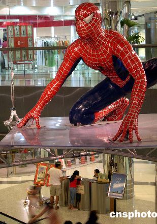 “蜘蛛俠”鬧市宣傳。正在香港熱播的電影《蜘蛛俠2》耗資二億制作,是上集的兩倍,其中五千四百萬美元用于計算機特技之上。圖為在香港新世界中心商場設(shè)置的蜘蛛俠造型吸引途人目光。作者:洪少葵