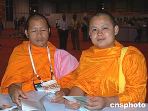2004年7月初,兩位身著袈裟的泰國(guó)僧人,作為志愿者為第十五屆世界艾滋病大會(huì)會(huì)務(wù)服務(wù)。中新社記者:曾利明