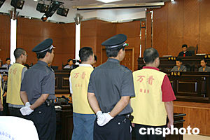 “一二·二三”特大井噴事故案今天上午九時(shí)三十分在重慶市第二中級(jí)人民法院開庭審理。圖為審判庭內(nèi)被告人在接受問(wèn)訊。作者:鄒輝