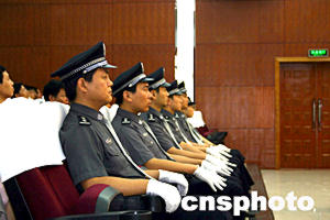 “一二·二三”特大井噴事故案今天繼續(xù)在重慶市第二中級人民法院進行庭審,該庭審已進入第二天。圖為法庭上的法警。作者:鄒輝