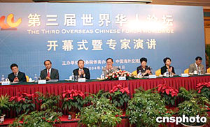 由國(guó)務(wù)院僑辦和中國(guó)海外交流協(xié)會(huì)主辦的《第三屆世界華人論壇》七月十五日在北京召開(kāi)。論壇以“建立中國(guó)----東盟自由貿(mào)易區(qū):華商面臨的挑戰(zhàn)、機(jī)遇和對(duì)策”為主題,邀請(qǐng)近百名海內(nèi)外企業(yè)家、政府官員、專家、學(xué)者相聚一堂,共謀發(fā)展。中新社記者:史利