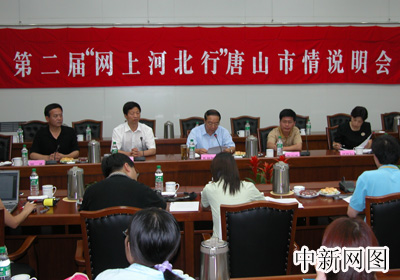 第二屆“網(wǎng)上河北行”采風(fēng)團(tuán)的記者們21日來到唐山市采訪,唐山市政府領(lǐng)導(dǎo)召開市情說明會(huì)向記者介紹了唐山現(xiàn)狀。圖為說明會(huì)現(xiàn)場。(秦欣攝)