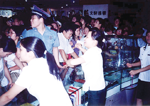下午2時,當記者趕赴現(xiàn)場時,書城門口的廣場已經被少男少女們“霸占”得幾無落腳之處。書城因此停止了營業(yè),禁止人員隨意出入;在近百名保安和工作人員的強力控制下,歌迷們被分批放進簽售內場,每次只放進五六個人。大量無法入內的歌迷因此不得不擁擠在書城門口內外,無法前進,也無法抽身后退。書城幾乎把所有的保安和工作人員都調集到現(xiàn)場來維持秩序,在林俊杰和歌迷群之間形成了一道人墻。