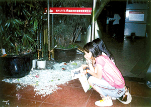 秩序一失控,眾多的歌迷不顧一切地往書城里面擁,而保安則用盡全力往外推-----突然驚叫聲連連,原來書城高大的玻璃門竟然被擠碎了!據現(xiàn)場的受傷歌迷介紹,當時玻璃碎片、渣滓從天而降,一個女歌迷的臉被推擠在被血染紅的玻璃尖刺上無法動彈!書城工作人員連忙打120叫來了急救車,把受傷的女歌迷送到了四川省人民醫(yī)院急診室。記者在現(xiàn)場看到其中一個女孩的后頸處有一道約5厘米長的血口,另一個女孩則腳淌鮮血,一瘸一拐地走來;她們原本被送到體育醫(yī)院,但因為要縫針才被轉送到省醫(yī)院來的。