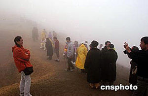 中國吉林長白山天池怪獸被之迷被傳媒稱為“世界四大未解之謎”(水怪之謎、野人之謎、百慕大三角之謎、飛碟之謎)之一。二○○四年七月中旬,成百上千的國內(nèi)外游客,冒著雨水和大霧登上海拔二千多米的天池火山口,期盼清日之中目睹長白山天池的真容和怪獸的蹤跡。天池是火山噴發(fā)自然形成的火山口湖,是中朝兩國的界湖。因為它所處的位置高(水面海拔2194米),所以稱為“天池”。中新社記者:鄒憲