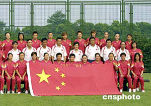 二○○四年七月二十三日,在上海備戰(zhàn)雅典奧運(yùn)的中國(guó)女子國(guó)家足球隊(duì)舉行賽前媒體見(jiàn)面會(huì),并拍攝全家福照片為出征奧運(yùn)留念。作者:湯彥俊