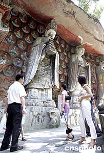 二○○四年七月下旬,游客在世界著名文化遺產(chǎn)重慶大足石刻參觀華嚴(yán)三圣中的文殊菩薩(左)和大日如來像。文殊菩薩手托重達(dá)千斤寶塔,歷時(shí)八百余年而不墜,體現(xiàn)了中國古代工匠對力學(xué)的精巧應(yīng)用。中新社記者:毛建軍