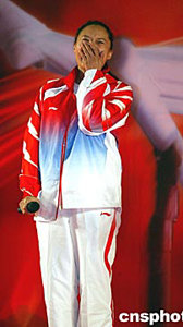 七月二十七日,即將出征雅典奧運(yùn)會(huì)的射擊運(yùn)動(dòng)員曹英身穿“錦繡中華”領(lǐng)獎(jiǎng)服,出現(xiàn)在李寧公司贊助二十八屆奧運(yùn)會(huì)中國(guó)軍團(tuán)發(fā)布會(huì)現(xiàn)場(chǎng)。李寧公司此次特為中國(guó)奧運(yùn)健兒準(zhǔn)備了“錦繡中華”領(lǐng)獎(jiǎng)服等裝備。中新社記者:鄭萍萍