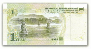 新版一元紙幣背面主景圖案為杭州西湖,左上方印有阿拉伯?dāng)?shù)字“1”,左下方印有面額“1YUAN”,右上方為“中國人民銀行”漢語拼音和蒙、藏、維、壯四種民族文字的“中國人民銀行”字樣、面額,右下方為年號(hào)和“行長之章”印鑒。