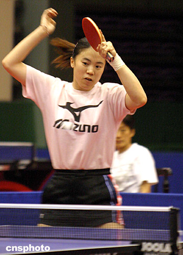 七月三十日上午,中國(guó)乒乓球女隊(duì)隊(duì)員王楠在河北正定乒乓球訓(xùn)練基地對(duì)抗賽中奮力拼殺,備戰(zhàn)奧運(yùn)會(huì)。中新社記者:張勤
