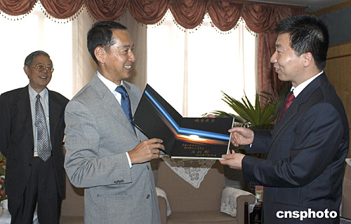 七月三十日,中國(guó)首飛航天員楊利偉(右)與日本首飛航天員毛利衛(wèi)(左二),在北京中國(guó)科技會(huì)堂會(huì)面。中國(guó)科學(xué)技術(shù)協(xié)會(huì)主席周光召(左一)主持了會(huì)見儀式。中新社記者:鄒憲