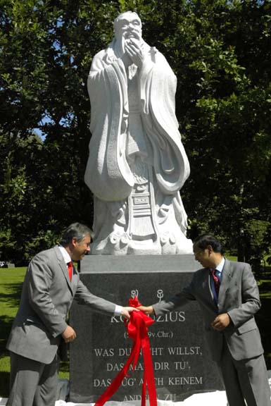 據(jù)大公網(wǎng)報道,這尊孔子雕像高2.5米,由細質(zhì)白麻花崗巖雕刻而成,基座上刻著“己所不欲,勿施于人”的孔子名言。它是中國國務院新聞辦贈送給柏林市的禮物。
