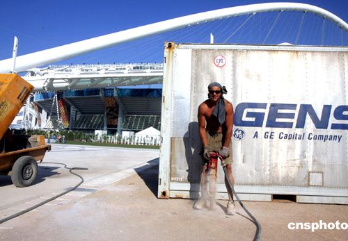 (當?shù)貢r間)二○○四年八月二日上午,一名鉆工在希臘雅典奧運會主會場外冒著烈日安裝配套設(shè)施,雅典奧運會主會場建設(shè)工程已經(jīng)收尾。中新社記者:任晨鳴
