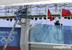 當(dāng)?shù)貢r(shí)間8月2日中午,驕陽(yáng)映照正在緊張排練奧運(yùn)會(huì)開(kāi)幕式的希臘雅典奧運(yùn)會(huì)主會(huì)場(chǎng)。國(guó)際奧委會(huì)所有會(huì)員的旗幟在體育場(chǎng)四周依次排列,鮮艷的中國(guó)國(guó)旗在體育場(chǎng)西南方向迎風(fēng)飄揚(yáng)。中新社記者:任晨鳴