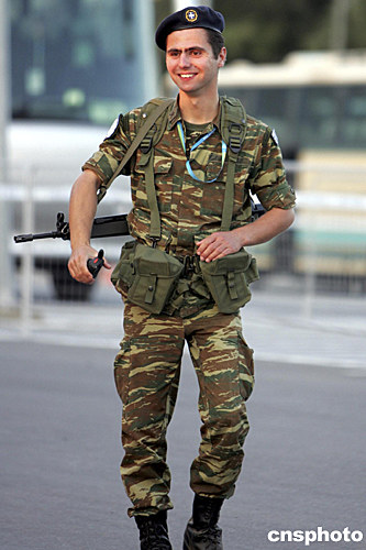 當(dāng)?shù)貢r(shí)間8月2日傍晚,一名肩挎微型沖鋒槍的希臘軍警執(zhí)勤后輕松地下崗返回軍營。奧運(yùn)會(huì)期間,雅典奧運(yùn)會(huì)所有場地除了警方嚴(yán)加守衛(wèi)外,都有配備沖鋒槍的軍警執(zhí)勤,防范恐怖襲擊。中新社記者:任晨鳴
