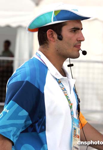 (當(dāng)?shù)貢r間)二○○四年八月三日清晨,一名英俊的雅典奧運會男志愿者在記者新聞中心外調(diào)度穿梭巴士。中新社記者:任晨鳴