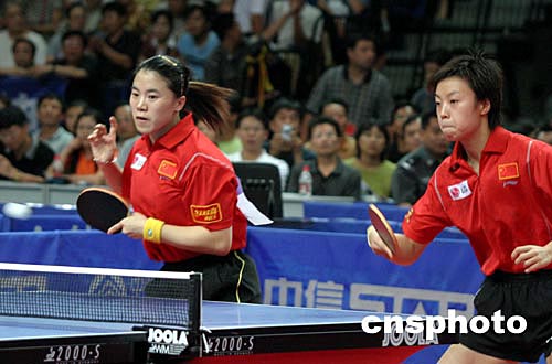 中國國家乒乓球隊(duì)出征雅典奧運(yùn)會前最后一次熱身賽二○○四年八月二日至三日在河北秦皇島市奧林匹克體育館舉行,八月三日晚女子雙打決賽王楠(左)、張怡寧以四比三勝郭躍、牛劍鋒獲得第一名。中新社記者:張勤