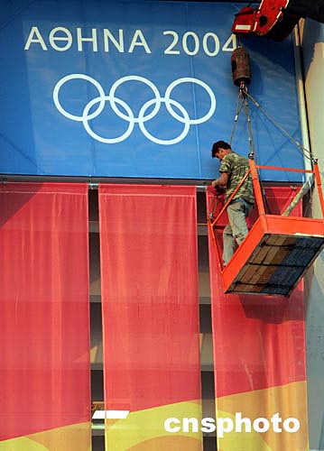 當(dāng)?shù)貢r(shí)間8月3日晚,一名建筑工人在雅典奧運(yùn)會(huì)主體育場(chǎng)安裝加固旗幟,開(kāi)幕式將于8月13日在這里舉行。中新社記者:任晨鳴