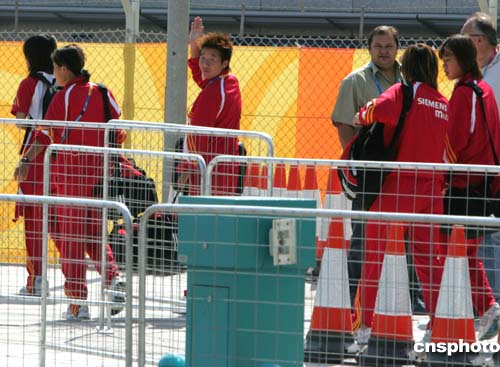 當?shù)貢r間8月6日下午,參加雅典奧運會的中國女足抵達雅典,隊員畢妍在嚴密的保衛(wèi)下向遠在隔離線外的記者招手。中新社記者:任晨鳴