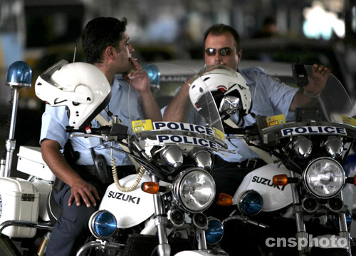 當?shù)貢r間8月6日晚,兩名為奧運會貴賓開道的雅典市警察在緊張的工作后,哥倆兒小聚抽支煙解解乏。雅典奧運會開支一再超標,其中投入安保的資金巨大,所有參與的警察通過各種方式的爭取而獲得了較為豐厚的加班費。中新社記者:任晨鳴