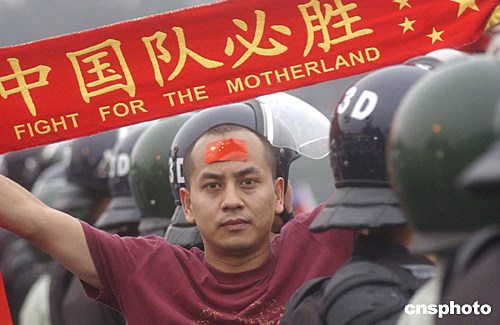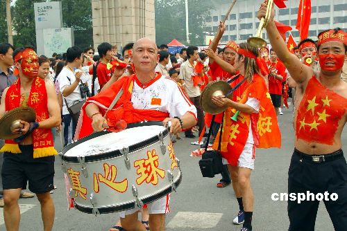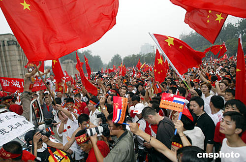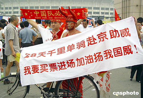 8月7日晚八時,2004年亞洲杯足球賽決賽中國隊(duì)與日本隊(duì)的比賽將在北京工人體育場舉行,各地球迷提前到達(dá)北京工人體育場為中國隊(duì)加油。圖為北京工人體育場外為中國隊(duì)加油的球迷。