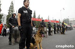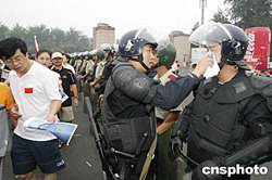 8月7日,在亞洲杯決賽中國隊(duì)對(duì)日本隊(duì)的比賽開賽之前,大批的防爆警察進(jìn)駐北京工人體育場(chǎng),確保賽場(chǎng)的安全。圖為一名防爆警察為同伴擦汗。中新社記者:盛佳鵬