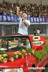 由中國兒童少年基金會主辦的“關(guān)愛兒童遠(yuǎn)離傷害”中國明星足球隊對戰(zhàn)公益企業(yè)聯(lián)隊義賽八日晚在河北省秦皇島市舉行,來自中國香港演員張衛(wèi)健在比賽前的慈善晚會上獻(xiàn)歌助興。中新社記者:廖文靜