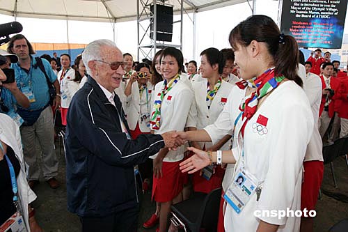 在升旗儀式進(jìn)行的過(guò)程中,前國(guó)際奧委會(huì)主席薩馬蘭奇在陪同人員的攙扶下抵達(dá)現(xiàn)場(chǎng)。薩翁的蒞臨,引起了全場(chǎng)熱烈的掌聲。中國(guó)代表團(tuán)的教練、運(yùn)動(dòng)員紛紛起立與之握手、合影,致使升旗儀式中斷近兩分鐘。在短暫的逗留過(guò)程中,薩翁祝愿中國(guó)代表團(tuán)取得好成績(jī),為二00八年北京奧運(yùn)會(huì)打好基礎(chǔ)。