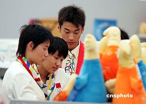 當(dāng)?shù)貢r(shí)間八月九日上午,參加雅典奧運(yùn)會(huì)的中國(guó)代表團(tuán)女子游泳小將江文菁(中)等利用賽前閑暇時(shí)間,在奧運(yùn)選手村逛商店,在琳瑯滿目的奧運(yùn)吉祥物紀(jì)念品前駐足留連。中新社記者:毛建軍