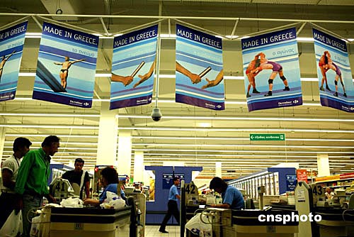 奧運會開幕在即,希臘雅典的商家們借奧運東風(fēng)開展促銷,家樂福超市里掛滿體育彩旗,宣傳推介當(dāng)?shù)爻霎a(chǎn)的日用品。中新社記者:王瑤