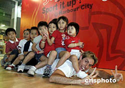 在8月世界體壇盛事,全城矚目之際,香港海港城特別聯(lián)同F(xiàn)itness First健身會所,向顧客提供多項(xiàng)在海港城SportX舉行的午間及晚間團(tuán)體跳舞課程,讓顧客有機(jī)會親身參與,強(qiáng)身健體活動。圖為9日教練現(xiàn)場與小朋友玩游戲。作者:洪少葵