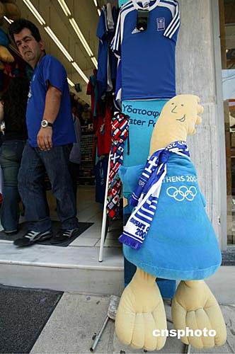 奧運會吉祥物雅典娜在雅典旅游紀念品商店前笑臉迎賓,店內(nèi)顧客盈門,生意紅火。中新社記者:王瑤