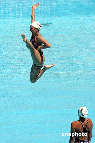 當(dāng)?shù)貢r(shí)間八月十一日上午,日本花樣游泳選手在雅典奧運(yùn)比賽場進(jìn)行熱身訓(xùn)練,動(dòng)作奇特。中新社記者:毛建軍