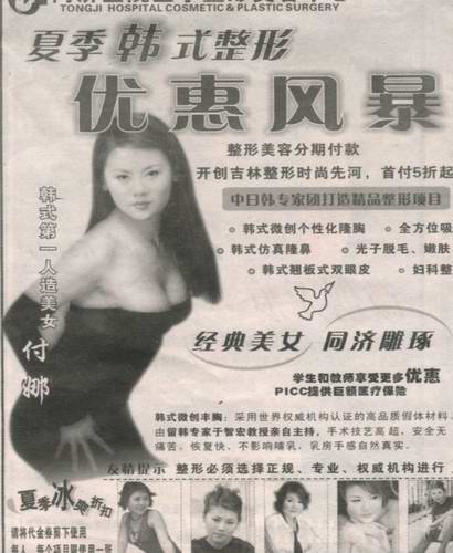 中新網(wǎng)8月12日電 據(jù)生活日報報道,在電影《手機(jī)》里游刃有余地同時飾演呂桂花、牛彩云兩個性格迥異角色的青年演員楊欣,因長相酷似鞏俐而被稱作“小鞏俐”,天生一副90、60、90三圍的火辣魔鬼身材。楊欣做夢也想不到,吉林省長春市某醫(yī)院醫(yī)學(xué)整形美容中心,鬼斧神工般地給她的代表性照片實施了“換頭術(shù)”,用楊欣的火辣身材和該中心“韓式第一人造美女”付某的頭臉,在當(dāng)?shù)匕l(fā)行量相當(dāng)大的一份報紙上做起了廣告。