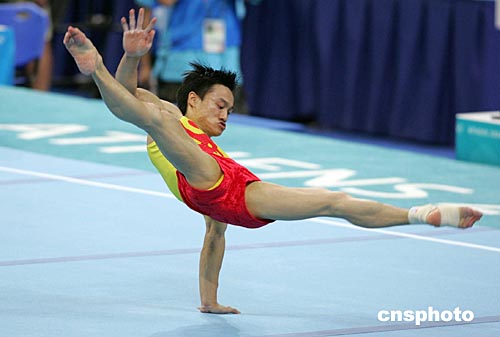 中國男子體操隊(duì)于當(dāng)?shù)貢r(shí)間八月十一日晚在雅典奧運(yùn)體操比賽館與德國、日本、烏克蘭隊(duì)進(jìn)行集體合練,圖為楊威在自由體操訓(xùn)練中。中新社記者:毛建軍
