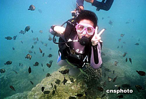 在三亞市,花上三百元左右就能在亞龍灣海中世界潛水觀光,這名中學(xué)生潛水正玩得開心。據(jù)悉,今年七月下旬以來,夏令營、學(xué)生團(tuán)、親子游、修學(xué)游等各種主題旅游紛紛推出,每天有五六百人的師生團(tuán)包機(jī)來海南,使海南暑期游再現(xiàn)火爆。作者:蔣聚榮