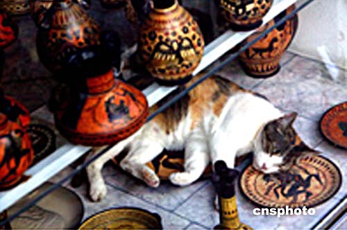 奧運(yùn)開幕在即,盡管外界氣氛緊張,一只家貓在雅典的工藝品商店櫥窗里酣然入睡。中新社記者:王瑤