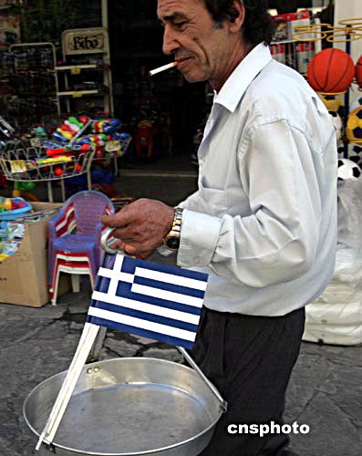 當(dāng)?shù)貢r間八月十二日,雅典奧運會開幕前夕,一名希臘老人帶著本國國旗在街頭行走,舉手投足間彌漫著強烈的愛國熱情。作者:任晨鳴
