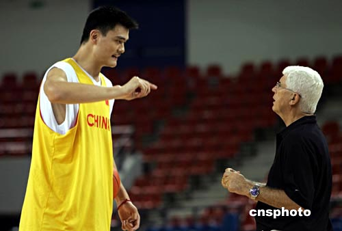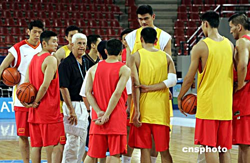 當(dāng)滿頭銀發(fā)的中國(guó)男籃主帥哈里斯姍姍出現(xiàn)在訓(xùn)練館內(nèi)時(shí),隊(duì)員們開始集合,此時(shí)比預(yù)定的訓(xùn)練時(shí)間晚了半個(gè)多小時(shí)。在例行的熱身活動(dòng)后,中國(guó)男籃分成黃、紅兩隊(duì)進(jìn)行了幾套戰(zhàn)術(shù)的演練。由姚明、易建聯(lián)、李楠、劉煒、朱芳雨等組成的黃隊(duì)無(wú)疑是中國(guó)男籃的主力陣容。