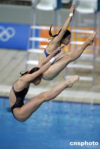 雅典奧運(yùn)開賽首日(14日)將產(chǎn)生兩枚跳水金牌。郭晶晶與吳敏霞是女子三米板雙人金牌的最大熱門。目前,郭晶晶和吳敏霞正在進(jìn)行緊張的賽前訓(xùn)練。中新社記者:毛建軍