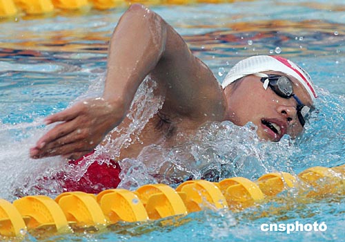 中國游泳名將齊暉當(dāng)?shù)貢r(shí)間八月十二日晚在雅典奧運(yùn)賽場進(jìn)行熱身訓(xùn)練。中新社記者:毛建軍