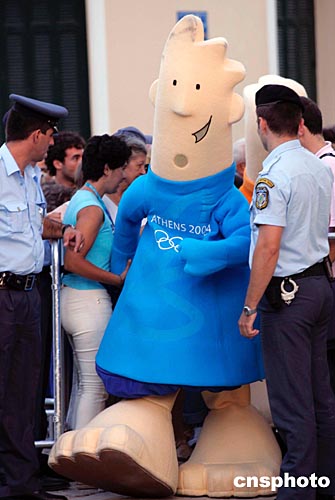 當?shù)貢r間8月12日傍晚,奧運火炬即將到達雅典衛(wèi)城。雅典市民夾道歡迎。奧運吉祥物在警察的護衛(wèi)下來到現(xiàn)場。中新社記者:張煒