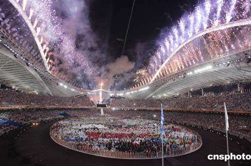 可容納七萬二千名觀眾的雅典奧林匹克體育場座無虛席,主題為“浪漫愛琴海”的開幕慶典獨具匠心,使現(xiàn)場氣氛達到了高潮。伴隨著悠揚的音樂和震天的鼓聲,一道彗星狀火焰從天而降,在“愛琴!敝悬c燃了奧運五環(huán)標志。一個名叫帕薩斯的男孩乘一條白色小船緩緩駛入“!敝,手中揮舞一面希臘國旗。國際奧委會主席羅格、雅典奧組委主席安吉洛普洛斯和希臘總統(tǒng)斯特凡諾普洛斯三人一起迎接他的到來。此時體育場大屏幕打出了本屆奧運會會徽——象征和平與自由的橄欖枝。