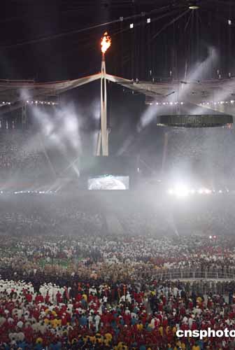 首次實現(xiàn)了真正意義上的全球傳遞的奧運圣火被傳遞到最后一名火炬手——希臘帆船世界冠軍科納馬納斯基手中,他用手中的小火炬點燃了紡錘形的主火炬,火炬臺慢慢回立至高空,奧運圣火在奧林匹克發(fā)源地熊熊燃起,光耀全球。
