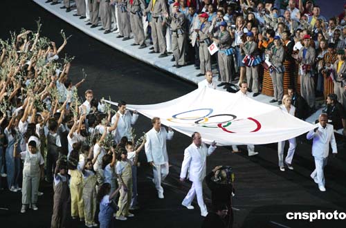 當(dāng)?shù)貢r(shí)間八月十三日晚,第二十八屆奧運(yùn)會(huì)在希臘雅典開幕,奧運(yùn)五環(huán)旗進(jìn)入開幕式會(huì)場(chǎng)。中新社記者:毛建軍