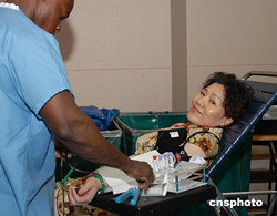 美東時間八月十四日,美國宗教團體在紐約法拉盛開展獻血活動,一百多位華人前來獻血,其中體檢合格的八十一人每人獻血500毫升。圖為在紐約、深圳、臺灣三地經營紅木精品家具的應霞華女士(右)一早趕到臨時獻血站獻血。作者:龔文謨