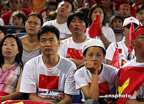當(dāng)?shù)貢r(shí)間8月15日,中國(guó)男籃在雅典奧運(yùn)會(huì)首輪比賽中迎戰(zhàn)西班牙隊(duì),最終中國(guó)隊(duì)以大比分負(fù)于對(duì)手。圖為現(xiàn)場(chǎng)觀戰(zhàn)的中國(guó)球迷感到十分失望。中新社記者:任晨鳴