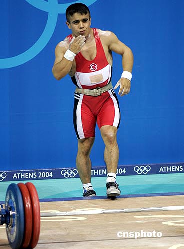 中國參加雅典奧運會男子舉重56公斤級比賽的吳美錦,當?shù)貢r間8月15日經(jīng)過艱苦搏斗終因?qū)嵙Σ罹喽∮谕炼涞拿麑⒛绿佤,最終獲得銀牌。中新社記者:任晨鳴