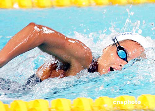 當(dāng)?shù)貢r(shí)間八月十五日晚,在雅典舉行的第二十八屆奧運(yùn)會(huì)游泳比賽中,法國選手MANAUDOU LAURE以四分零五秒三四的成績(jī)獲得女子四百米自由泳金牌。中新社記者:毛建軍