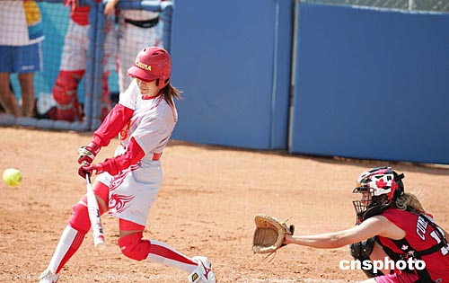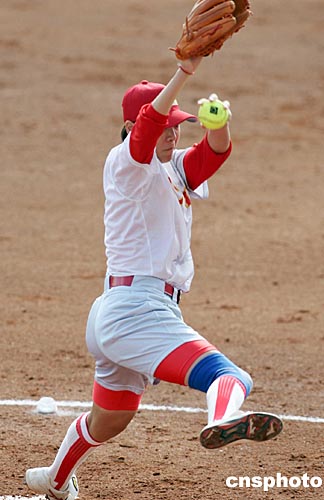 當(dāng)?shù)貢r間八月十六日,在雅典奧運(yùn)女子壘球比賽中,中國隊(duì)四比二戰(zhàn)勝加拿大隊(duì)。中新社記者:毛建軍